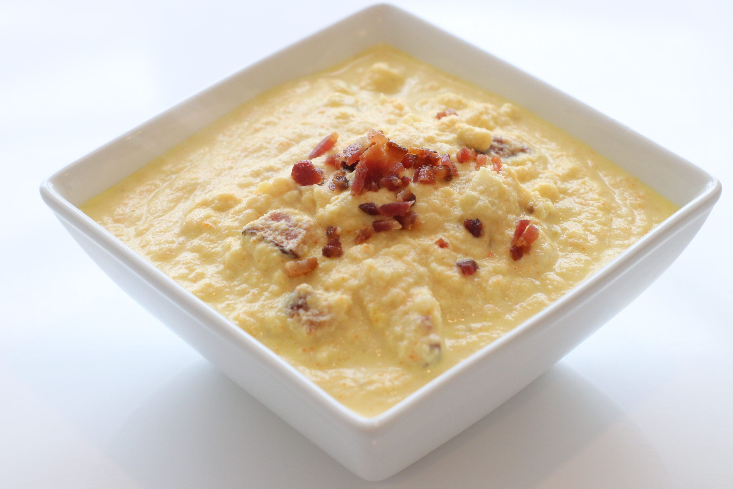 - Finish Soup: Add cauliflower and vegetable stock then bring to a simmer for 15 minutes until cauliflower is tender but not falling apart. Add half and half and simmer 4-5 minutes more. Remove from heat and pulse the soup several times using an immersion blender to chop up the cauliflower slightly and to thicken the soup. You can alternatively put 5-6 cups of the soup into a stand-up blender to blend. Once blended stir back into the pot with the rest of the soup. (Important Note: Do not over-blend the soup at this point as the cauliflower adds delicious texture and helps the soup taste heartier)