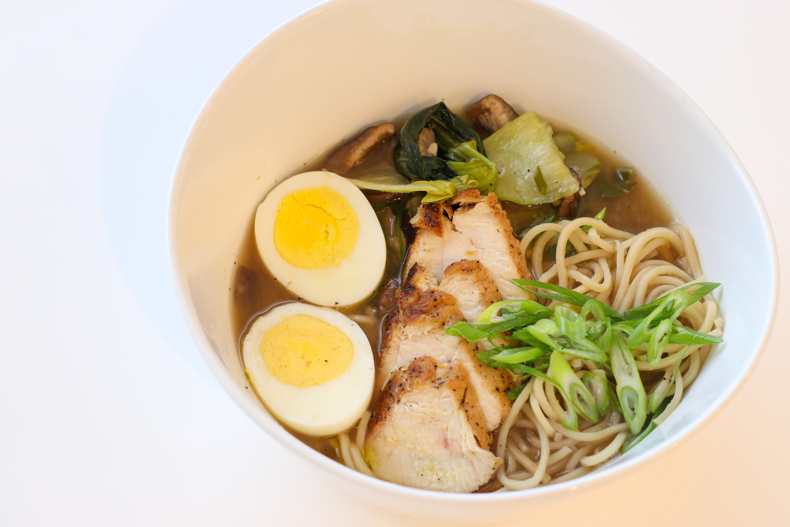 - Assemble Ramen: Using a large bowl, place a large portion of noodles in the bottom. Ladle the hot broth on top and put a large serving of the vegetables from the broth on top of that. Put two egg halves and a serving of chicken into each bowl. Top with a sprinkle of green onions. Itadakimasu!