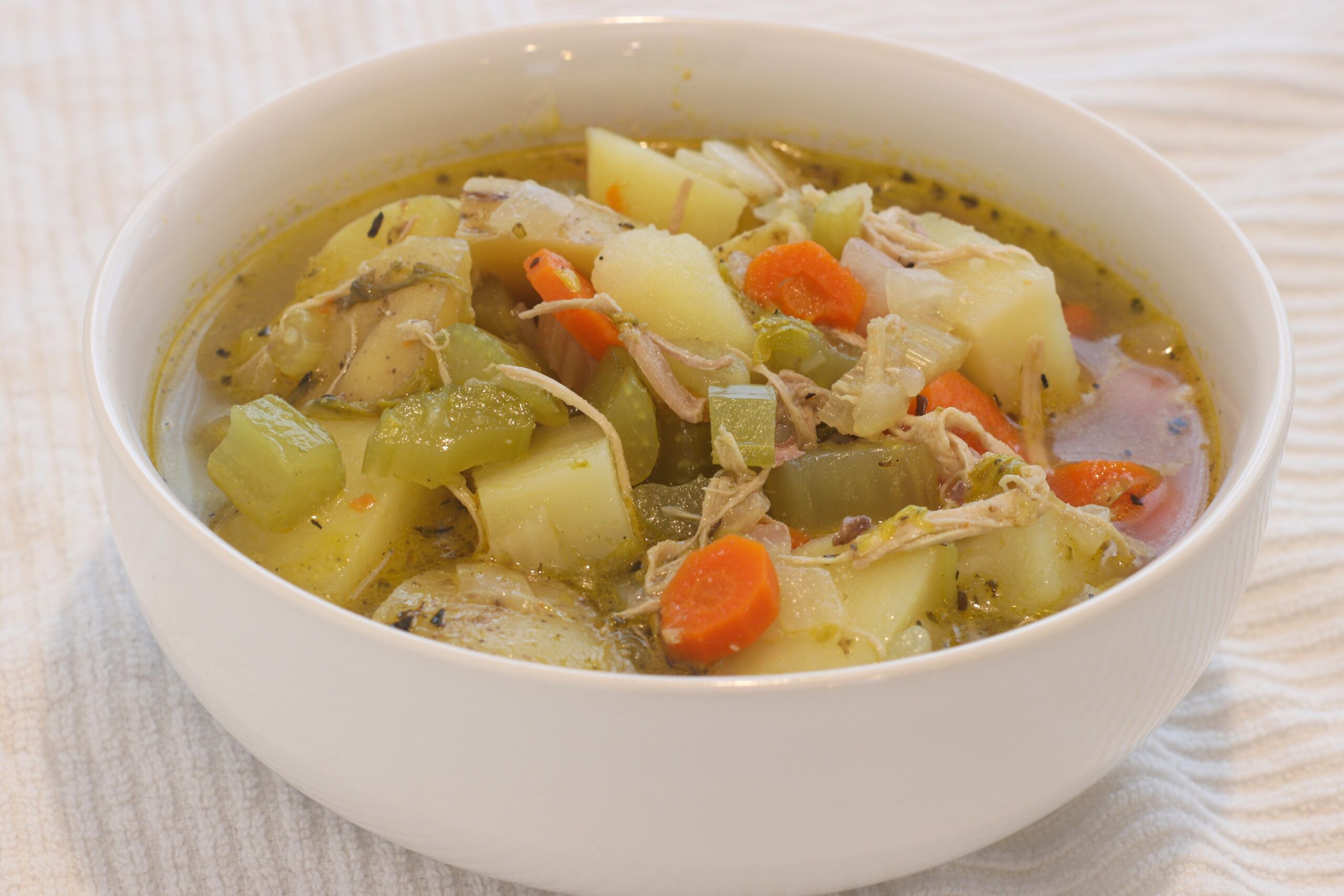 - Cook Vegetables: Peel and chop carrots, onions, and garlic. Chop celery. Heat a large stockpot over medium-high heat and add a small amount of oil. Add carrots, garlic, celery, and onions and cook stirring for 4-5 minutes until onion is translucent. Add chicken broth and bring to a boil. Peel and dice potatoes and shred turkey into bite-sized pieces. Add shredded turkey and potatoes then reduce heat and allow to simmer for 20 minutes until potatoes are soft.