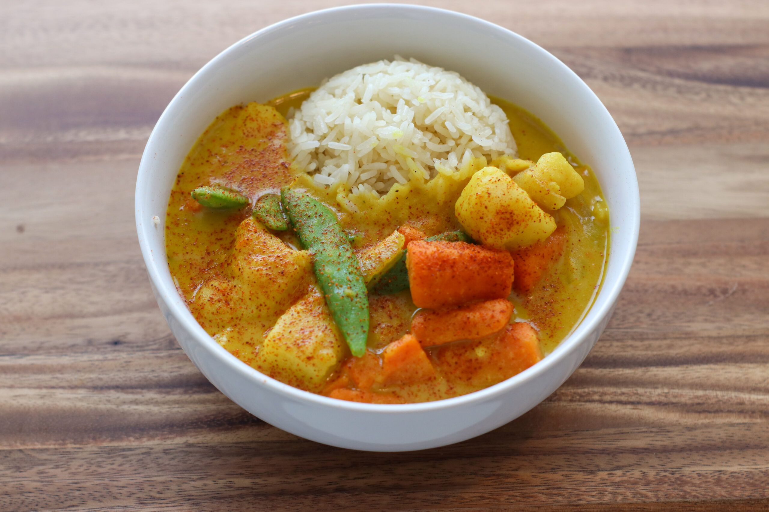 4. Serve: Place a large scoop of rice into each bowl. Ladle curry over the top and enjoy! You can optionally sprinkle cayenne pepper or additional red curry powder over the top as a garnish.