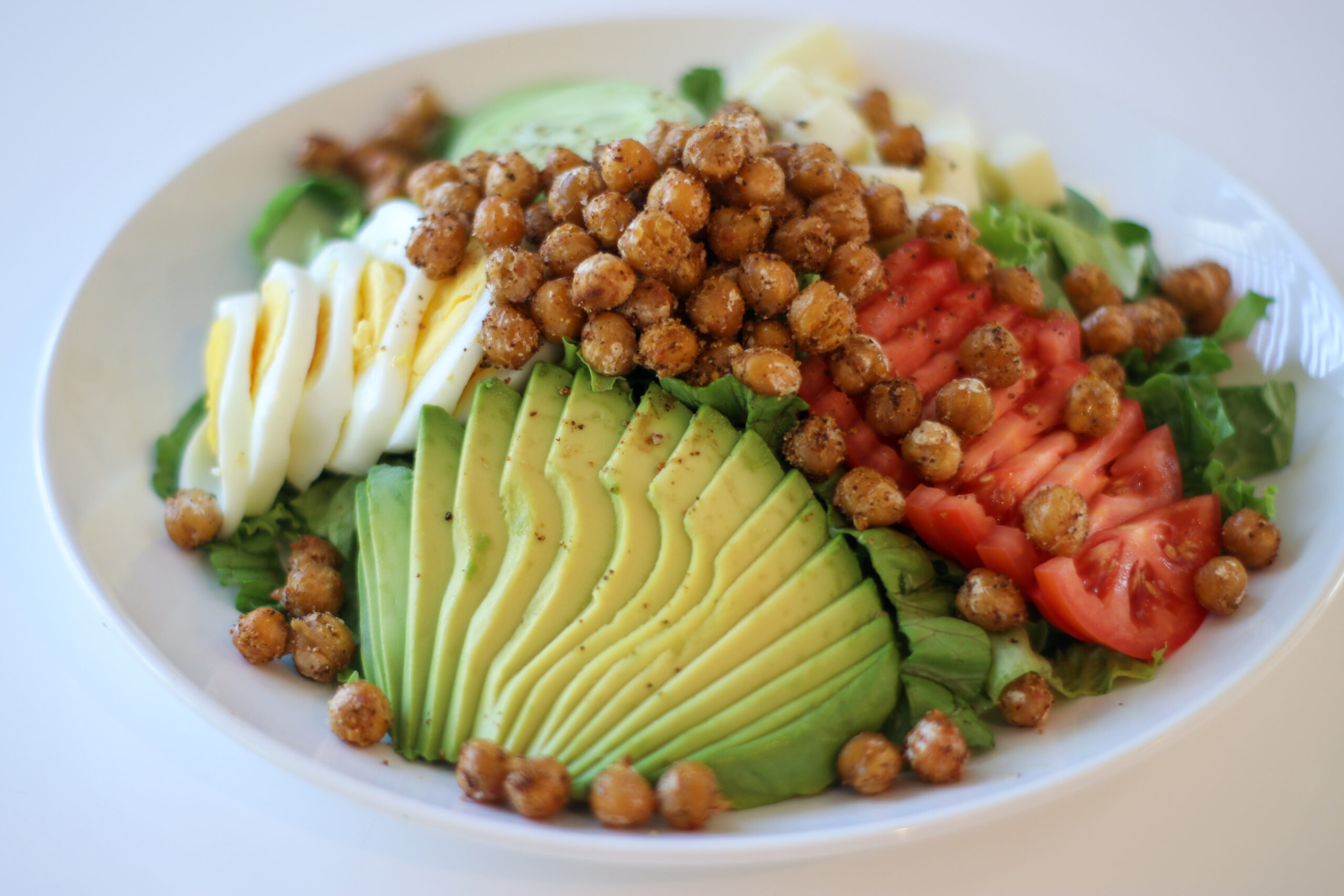 - Serve: Split lettuce evenly between four bowls or containers. Top each bed of lettuce with 1/2 avocado, 1 sliced egg, and an equal portion of tomatoes, cucumber and cheese. Finish the salad off by splitting the garbanzo beans between each of the plates. Serve with ranch and enjoy!